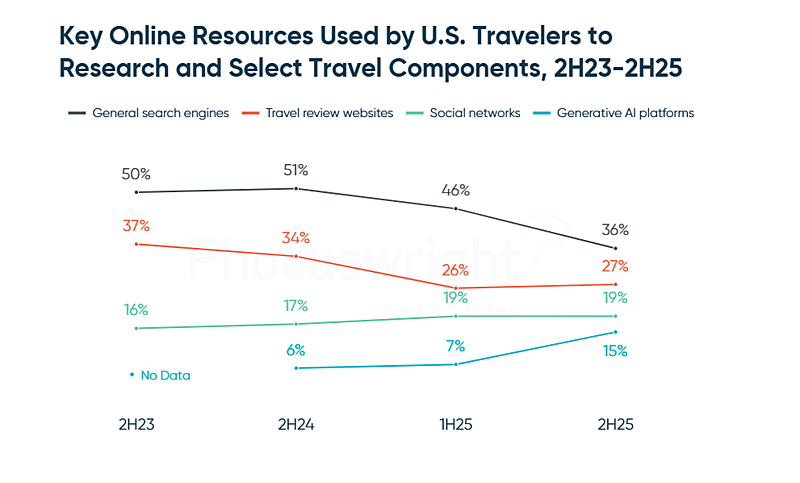 AIへの支持拡大に伴い、旅行者がリサーチや商品選択の際、利用するオンライン情報源も変化している。米国の旅行者を対象に実施した調査によると、2024年下期、全体の51%と圧倒的多数が利用していたのは「検索エンジン」だったが、2025年下期は36%に急降下。旅行レビューサイトの利用も、過去2年間で10ポイント減の27%となった。