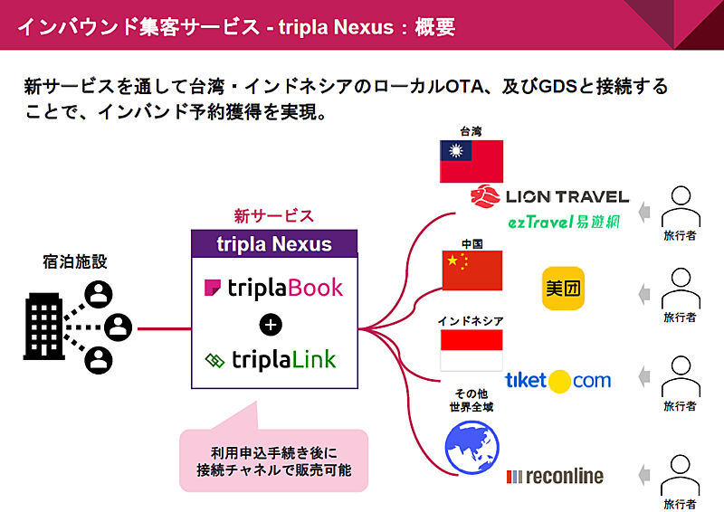 tripla Nexusが連携する海外ローカルOTAは、台湾のライオントラベルのほか、ezTravel、中国の美団(メイチュアン)、インドネシアのチケット・コムなどを予定。今後、アジア各地からの旅行者の増加が必至である中、宿泊施設が各地域のローカルOTAに直接掲載できることは大きなメリットになるはずだ。