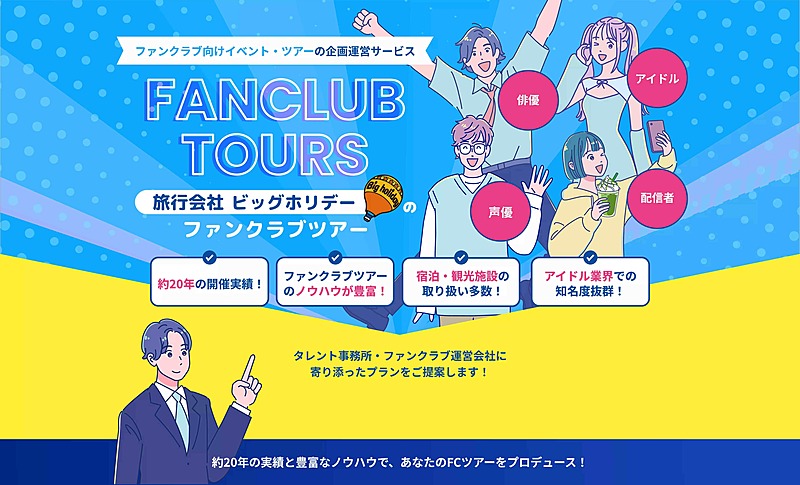 旅行事業をおこなうビッグホリデー社は、芸能事務所およびファンクラブ運営会社向けに、旅行とイベントを組み合わせた「ファンクラブツアー」の企画・運営を支援するサービスを開始する。