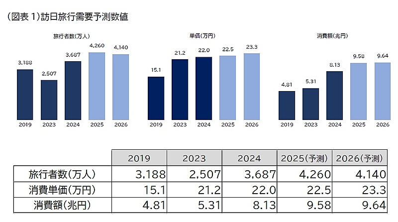 また、訪日消費額は同100.6%の9.64兆円と予想。旅行コストの上昇に加え、滞在期間の長い欧米豪市場からの旅行者増加によって、総消費額は前年を超えると見通している。