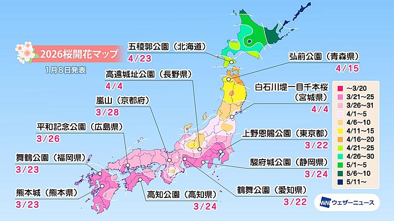 全国の桜の名所については、東京の上野恩賜公園が3月22日、熊本城が3月23日、 広島の平和記念公園が3月26日、京都の嵐山が3月28日、宮城の白石川堤一目千本桜が4月4日、青森の弘前公園が4月15日、北海道の五稜郭公園が4月23日と予想している。
