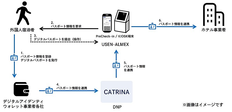 具体的には、国際標準に準拠した高いセキュリティのデータ管理機能と暗号鍵技術を備えたDNPの認証基盤「DNP分散型ID管理プラットフォーム CATRINA(カトリーナ)」による宿泊者認証をおこなう。USEN-ALMEXが展開するホテル向けKIOSK・オンライン事前チェックインサービス「PreCheck-in」とDNPの認証基盤の連動によって、宿泊者名簿作成や本人確認の自動化を実施する。