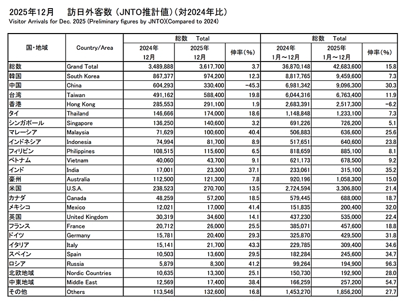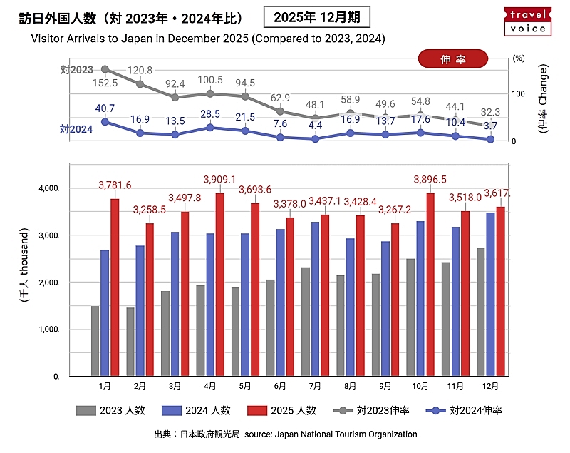 2025年12月単月では2024年(348万9888人)比3.7%増の361万7700人で、12月として過去最多を記録。ただし、伸び率は年間で最も小さく、市場別で前年比45%減となった中国市場の動向による影響がうかがえる。