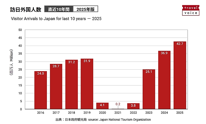 日本政府観光局(JNTO)が発表した2025年1年間の訪日外国人旅行者数(推計値)は、4268万3600人で、過去最多だった2024年(3687万148人)から15.8%増(約580万人増)となった。2023年(2506万6350人)比では2年間で、約1700万人(70.3%増)以上増加。コロナ前の最多だった2019年(3188万2049人)と比べると、この6年で1000万人以上、上回った。