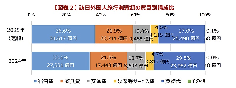 費目別では、宿泊費が3兆4617億円(構成比36.6%)と最も多く、次いで買い物代2兆5490億円(同27.0%)、飲食費2兆711億円(同21.9%)の順だった。前年同期と比べると、宿泊費の構成比は増加し、買い物代は減少した。