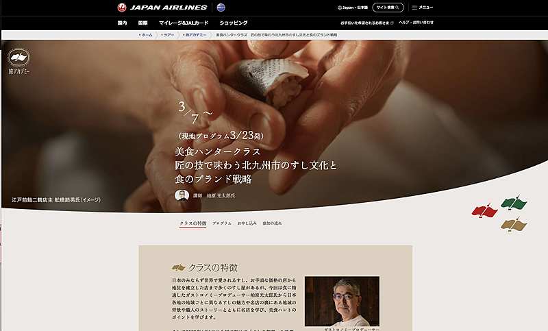 JALは、北九州市の「すし文化」に焦点をあてたガストロノミーツアー「美食ハンタークラス 北九州市で匠の技とすしを取り巻く文化を目と舌で体感する2日間」を実施する。2026年3月23日の1泊2日で羽田空港発着と現地参加プランを提供する。