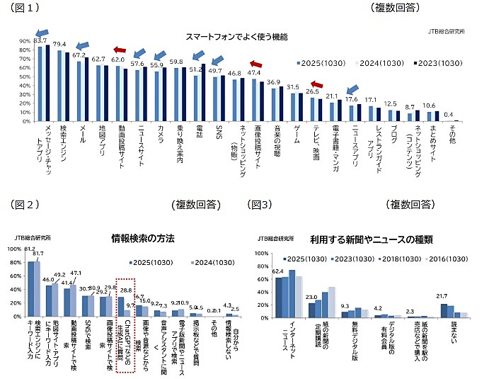 これによると、スマホでよく使う機能は「メッセージ・チャット」、「メール」などのコミュニケーション手段が減少し、「動画や画像投稿サイト」、「テレビ・映画」などの映像コンテンツ系が上昇。情報検索手段は「生成AI」が2024年の9.7%から28.8%へと約3倍に増加した。