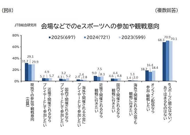 このほか、eスポーツの存在感が増している。29歳以下の男性では約半数がプレイ・観戦経験を持ち、さらに「現地に行きたい」という強い意向を示した。eスポーツと聞いて具体的にイメージできるものについて、全体では「eスポーツのイベント、大会(18.7%)」が最も高かった。特に男性29歳以下では「eスポーツチームやプロゲーマー(30.2%)」や「eスポーツに力を入れている企業(19.8%)」が支持されており、JTB総研は「eスポーツと企業のイメージが紐づいている場合も多い」とみている。