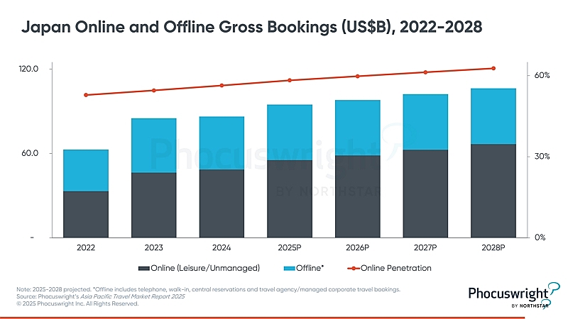 日本のオンラインおよびオフラインの総旅行予約高(米ドル建て)2022~2028年:フォーカスライトより