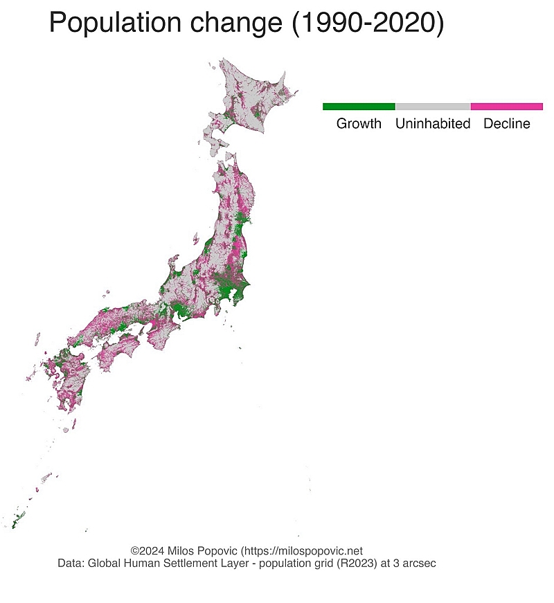 地図作家Milos氏(@milosmakesmaps)が製作した「日本の人口変化地図」
