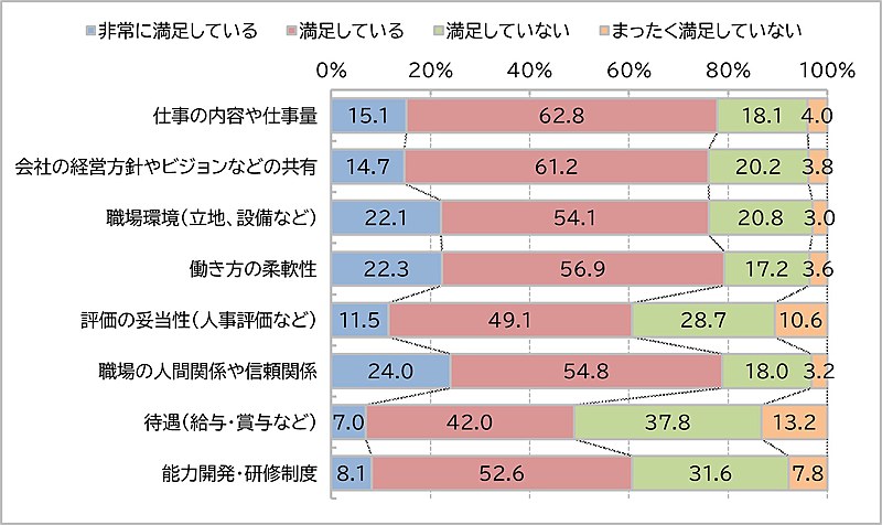 現在の仕事(勤務先)に対する満足度については、「職場の人間関係や信頼関係」「働き方の柔軟性」「職場環境(立地、設備など)」で、満足している(「非常に満足している」+「満足している」)という回答が過半数を占めた一方、「待遇(給与・賞与など)」では、不満が満足を上回った。