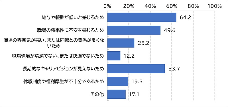 調査では、現在働いている会社での勤続意向についても聞いている。「働き続けたい」(「とてもそう思う」+「そう思う」)が76.8%を占めた。その理由でトップだったのは「職場の雰囲気や同僚との関係が良好であるため(64.3%)」。次いで「休暇制度や福利厚生が充実しているため(36.5%)」「給与やボーナスが満足できる水準であるため(32.0%)」が続いた。働き続けたくない理由のトップは「給与や報酬が低いと感じるため(64.2%)」。次が「長期的なキャリアビジョンが見えないため(53.7%)」となった。