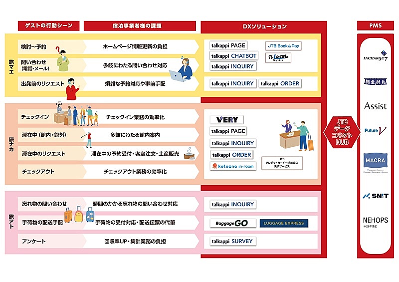 これまでJTBは、宿泊施設向けDXソリューションとして複数の外部ベンダーと連携し、サービスを展開してきた。たとえば、宿泊者が自身のスマートフォンで館内・周辺情報の閲覧や、施設側と母国語でコミュニケーションができるチャットツール「Kotozna In-room」、キャンセル料の回収自動化ツール「Payn」、利用者のスマートフォンから注文を受け付けるセルフオーダーサービス「QR Order」などだ。今回、それらのサービスラインナップに「talkappi」と「VERY」が加わった。宿泊施設がタビマエからタビアトまで、さまざまな領域の業務を効率化するソリューションを補完しあう体制を整えた。