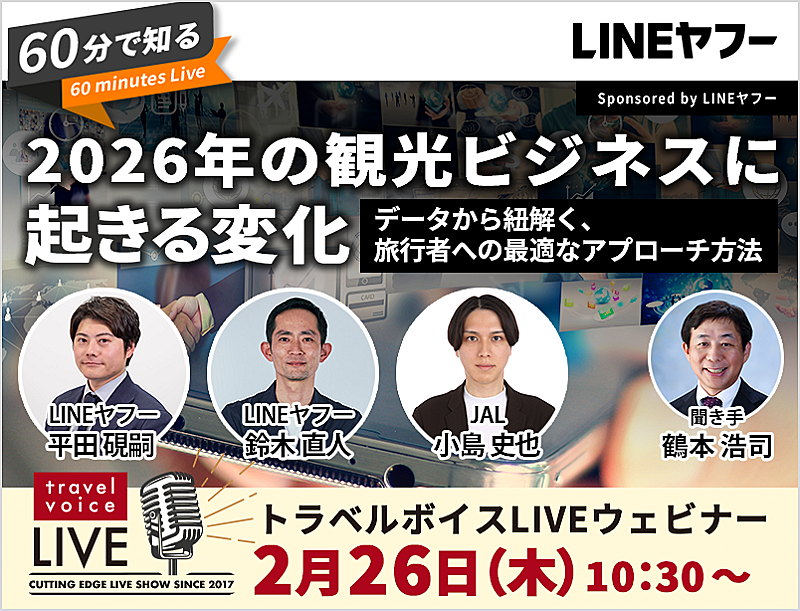 観光産業ニュース「トラベルボイス」は2026年2月26日(木)、トークショーイベント「トラベルボイスLIVE ― 60分で知る、2026年の観光ビジネスに起きる変化 ― LINEヤフーのデータ解説と、旅行者との『日常接点』の作り方」をオンラインで開催する。