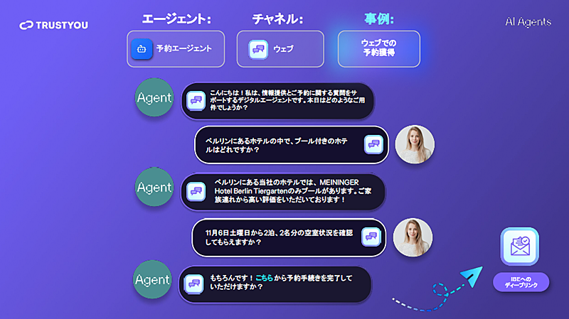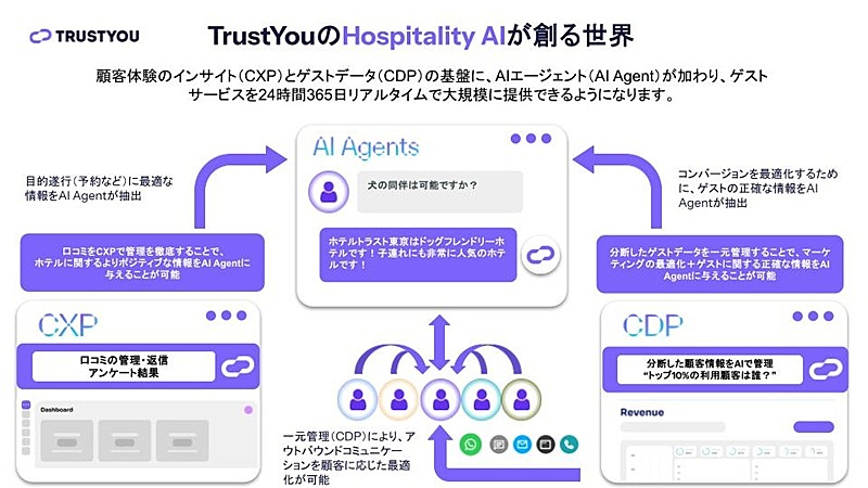 「AIがゲストのインサイトが詰まったクチコミデータの分析や定型的な対応を担うことで、宿泊施設の内部の知見だけでは行き届かなかった細部までおもてなしを徹底し、潜在顧客の離脱を防いで、ゲストのエクスペリエンスを高める。そして、AIから現場のスタッフへとゲストをシームレスに引き継ぎ、人にしかできないおもてなしに集中できる時間を取り戻していく。テクノロジーの力で、人と人との温かな触れ合いを最大化させるサポートをするのが、我々トラストユーの使命だ」と締めくくった。