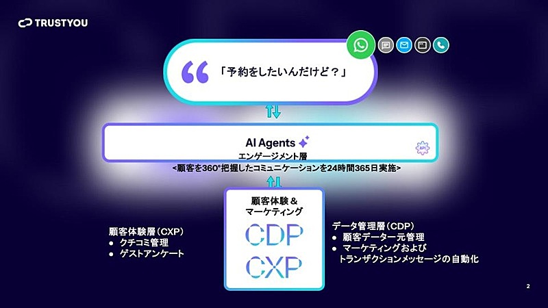 2つ目のCDPは、今回のサービス拡充の要であり、トラストユーの強みを最大化するプラットフォームだ。PMS(ホテル管理システム)、予約エンジン、マーケティングツールなどで分断されていた顧客データを一元管理・分析し、ゲストの真の姿やニーズを理解するための基盤となる。