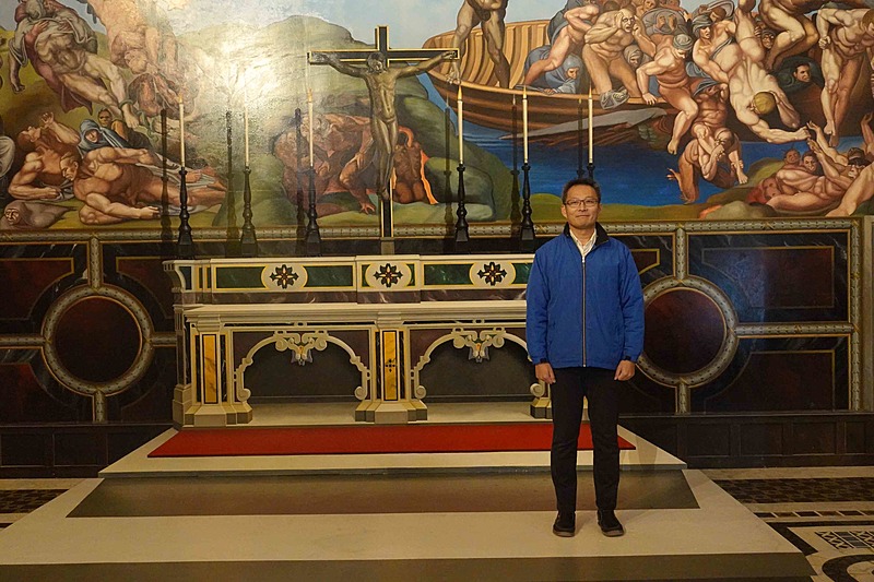 「ミケランジェロ館」で清水さん。ここには、ゴヤ「着衣のマハ」やエドワード・ホッパー「ナイトホークス」などのトリックアートがある