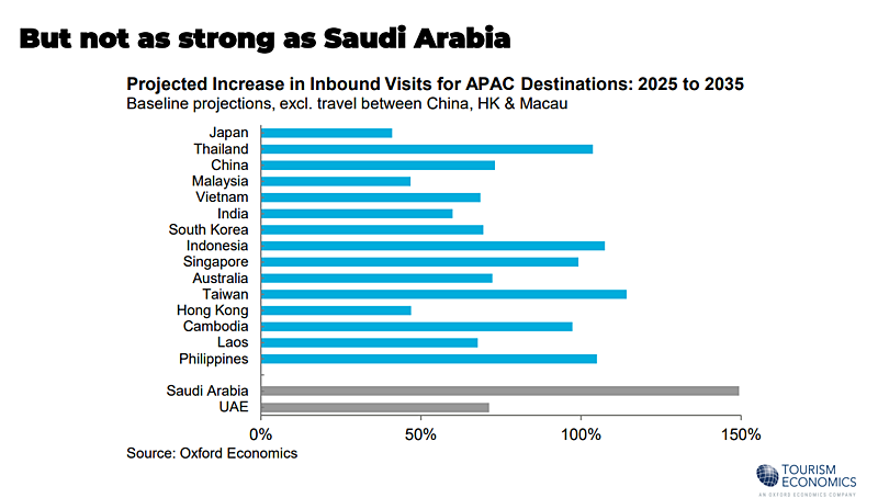 こうした世界的な傾向の中で、APAC地域は特に高い成長が期待されている地域だ。2035年までにAPACのインバウンド観光は2025年対比で75%増加する見通しで、中東を除けば世界で最も高い成長率となる。経済成長や人口動態の変化に加え、新たな観光地の開発や体験型コンテンツの拡充が、地域全体の魅力を押し上げている。