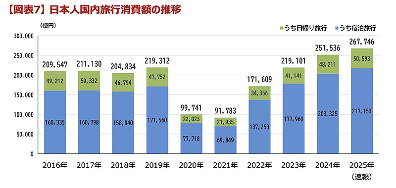 調査結果によると、2025年の日本人の国内旅行消費額は前年比6.4%増の26兆7746億円。内訳は宿泊消費額が同6.8%増の21兆7153億円、日帰り旅行消費額が同4.9%増の5兆593億円だった。