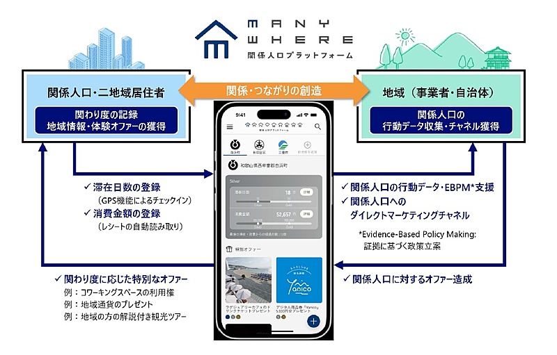 「MANYWHERE」では、二地域居住者が自身の滞在履歴を記録できるだけでなく、アプリを介して、その地域との関わり度合いに応じた特別な地域体験のオファーを得ることができる。自治体や事業者にとっても、アプリ登録者の関与・活動状況をデータで把握することができることから、これまで困難だった関係人口の可視化も可能となる。