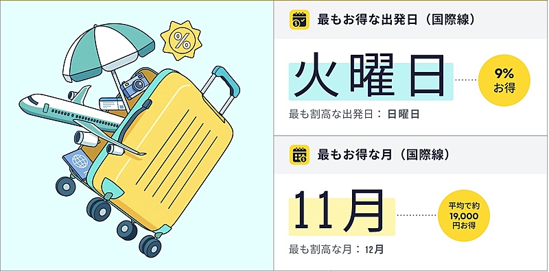 月別では、旅程や座席ランクを問わず、最も割安に旅行できる月は11月。最も割高な12月と比べて平均で44%、片道あたり平均約1万9000円割安になるという。国内線に限ると、最も割安な月は1月。最も割高な8月と比べると、平均で38%割安になる。