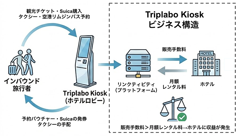 BtoBチケット販売管理プラットフォームのリンクティビティは、タビナカの交通や観光チケットを販売できるキオスク端末「Triplabo Kiosk(トリップラボ・キオスク)」を開発した。ホテルや観光案内所でタビナカの個人旅行者、特に訪日外国人旅行者の利用を見込んでいる。