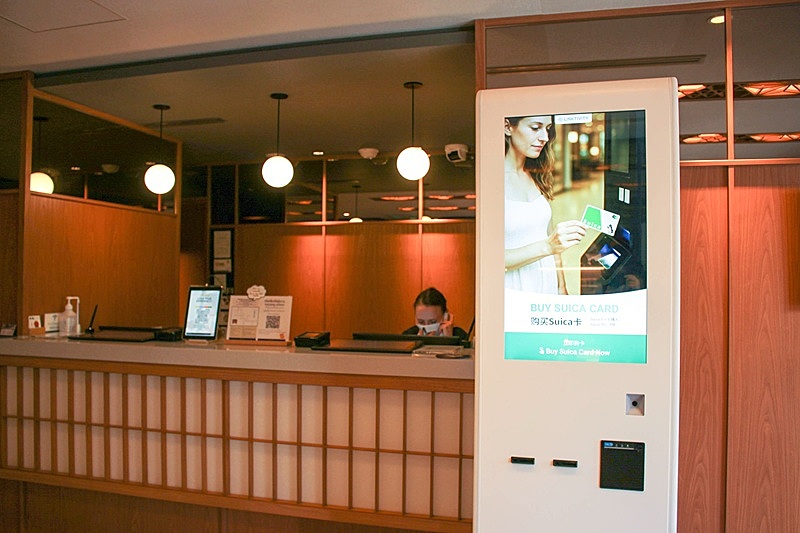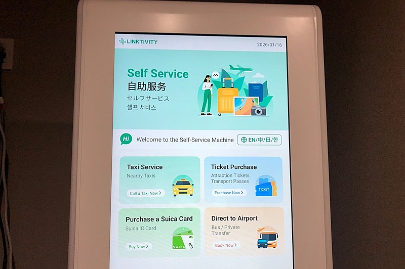 Triplabo Kioskは、大型タッチ画面を備えた多言語対応(中国語:簡体字・繁体字、英語、韓国語、日本語)端末だ。ホテルのロビーなどのパブリックスペースに設置し、宿泊者が24時間いつでも自ら操作して商品を購入できるように設計した。現在は、タクシー手配、Suica(Welcome Suica Card)購入、人気観光施設や周遊パスのチケット購入、空港リムジンバスの予約・購入の4つのサービスを提供。いずれも、宿泊者のニーズが高い商品を揃えた。