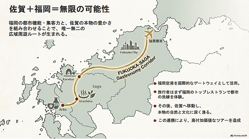 「福岡空港を起点に佐賀に行く。そこから長崎に行くような広域ルートも考えたらどうか。福岡にあるデスティネーションレストランで都市の洗練を体験し、そこから福岡や佐賀の自然と文化の深部に触れて、他の地域へ広げていく。離島に行ってもいい。そんなガストロノミーツーリズムも考えられるのではないか」。