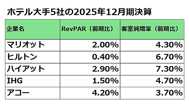 世界大手ホテル5社(マリオット、ヒルトン、ハイアット、IHG、アコー)の2025年度通期決算が出そろいました。今回は、その横断分析をお届けします。
