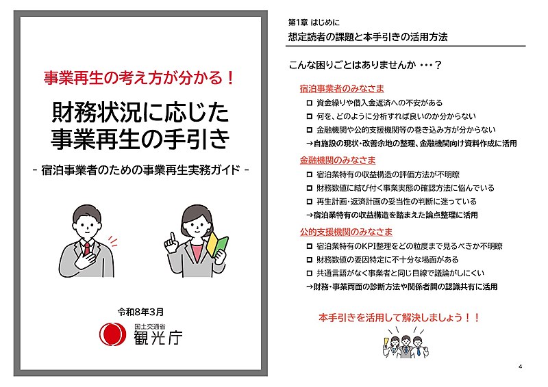 観光庁は、宿泊事業者の経営力・収益力の向上を支援する目的で、「財務状況に応じた事業再生の手引き」 と「限られた人材活用と業務改革の手引き」を作成した。
