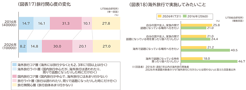 また、「話題になっている場所に行きたい」(コト志向)と「話題になっている物を買ったり食べたりしたい」(モノ志向)とを比べると、2026年には、国内でも海外でも「コト志向」が「モノ志向」を上回った。