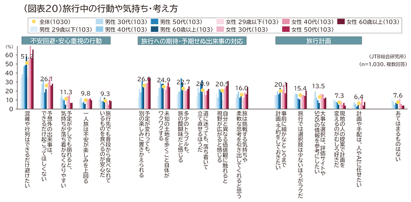 旅行中の行動や気持ち、考え方についても調査。「混雑や行列はできるだけ避けたい(51.2%)」「予想外の出来事は、できるだけ起こってほしくない(26.1%)」といった、不安回避・安心を重視したいわゆる“メンパ行動”(メンタルパフォーマンス、精神的な消耗を避ける行動)のメンパ旅の指向が上位となった。