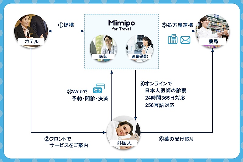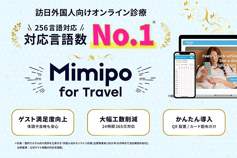 Mimipo for Travelは2025年6月にサービスを開始。24時間365日対応のオンライン診療をホテル客室から受診できるほか、近隣薬局での処方薬受け取り、帰国後の海外旅行保険申請サポート、近隣医療機関の紹介・予約サポートまでをワンストップで提供している。現在、120社1200施設以上(2026年3月26日時点)のホテル事業者に導入されている。