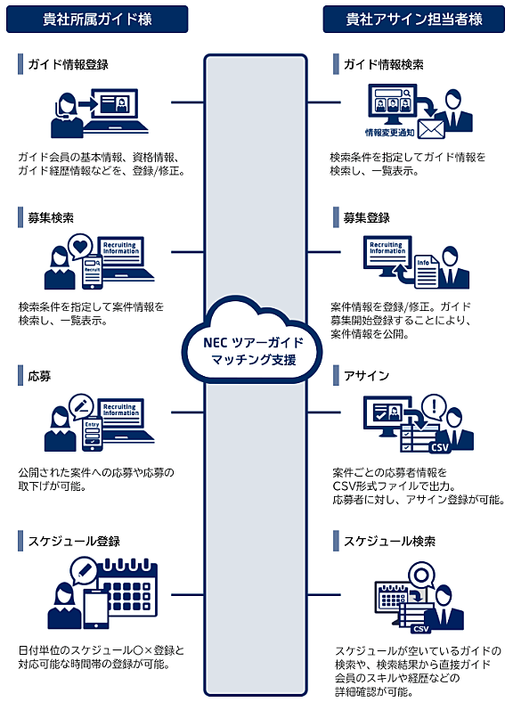 NECツアーガイドマッチング支援サービスのイメージ。運営側とガイド側で生じる業務を効率化する
