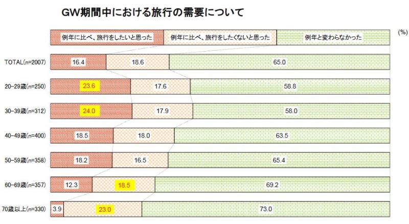 With regard to willingness to travel, people who were more willing to travel this year than before accounted for 16.4% on average, and the ratios were beyond 20% in 20s and 30s. On the contrary, the ratio of people who were less willing to travel this year than before reached 18.6%, particularly high in 60s and 70s.