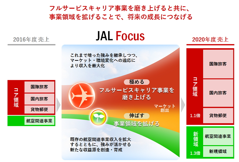 In the new plan, JAL aims at 1.1 times more sales for the core air transport business than FY2016 and 1.3 times more sales for airline-related and new businesses than FY2016.