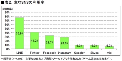 The questionnaire survey conducted by ICT Research & Consulting in October 2017 shows that 83% of all 4,196 respondents answered that they use SNS or phone/mail apps as communication tools. The most popular SNS app was LINE (76.9%), followed by Twitter (41.2%), Facebook (32.7%), Instagram (28.6%), Google+ (9.2%), Skype (9.2%), and mixi (6.2%). Compared to last year, the usage rates of LINE, Instagram and Twitter increased, especially that of Instagram (from 22.1% to 28.6% this year).