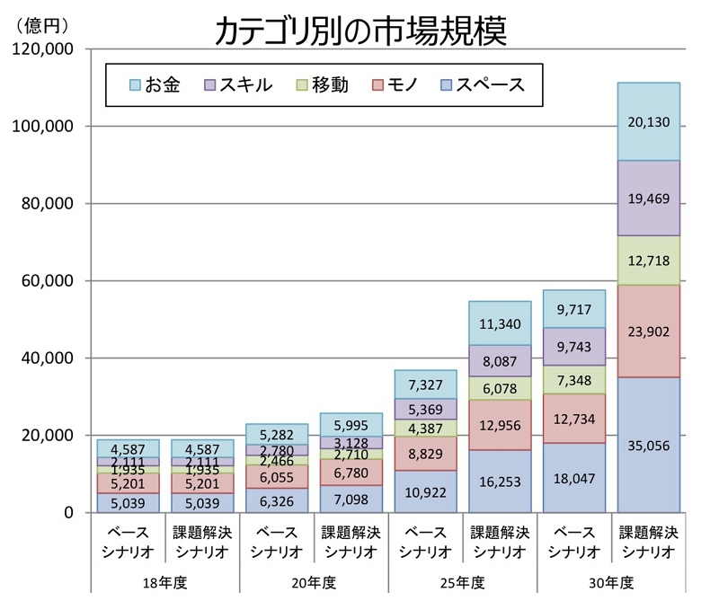 The total economic scale in 2018 comprised 503.9 billion JPY for space sharing including private accommodation and parking, 520.1 billion JPY for goods, 458.7 billion JPY for money, 193.5 billion JPY for mobility including car sharing and 211.1 billion JPY for skills.
