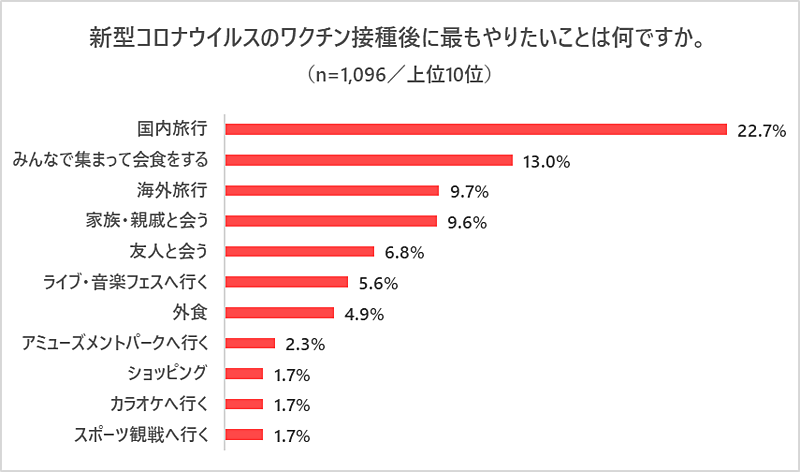The survey results show that the most desirable thing to do is domestic travel with the ratio of 22.7%, and even overseas travel is ranked 3rd with the ratio of 9.7%.