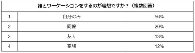 調査では、「誰とワーケーションをするのが理想ですか?」という問いに対して、56%が「自分のみでワーケーションをしたい」と回答。特に男性に顕著で、約60%の男性が1人でワーケーションを希望している傾向が明らかになりました。