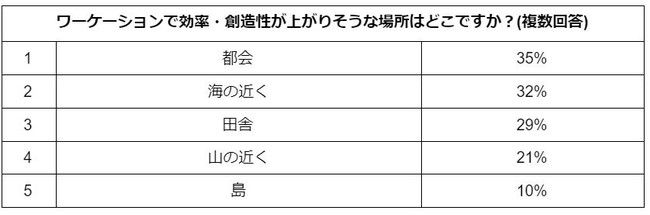 さらに、「ワーケーションで効率・創造性が上がりそうな場所」では、35%が利便性の高い都会を選んだ一方、山の近く、海の近く、田舎、島などでの意向が63%となり、自然に囲まれた環境下での充実したワーケーションを希望する人が多くいることがわかりました。